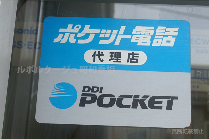 埼玉県所沢市あたりの電気店の扉に貼られているDDI「ポケット電話」のステッカー。