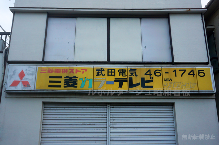 東京都三鷹市の電機店跡に残されている「三菱電機ストア・三菱カラーテレビ NEWダイヤトロン」 の看板。