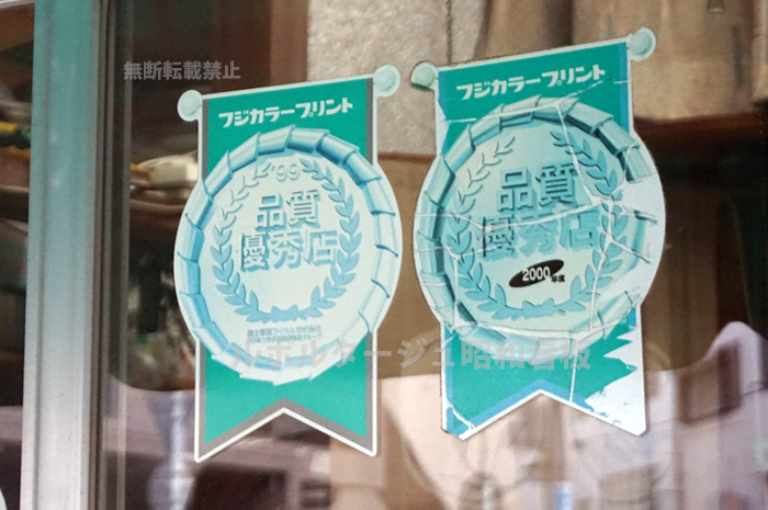 神奈川県横浜市神奈川区のある商店の扉に貼ってある富士フィルム「フジカラープリント品質優秀店」 のステッカー。